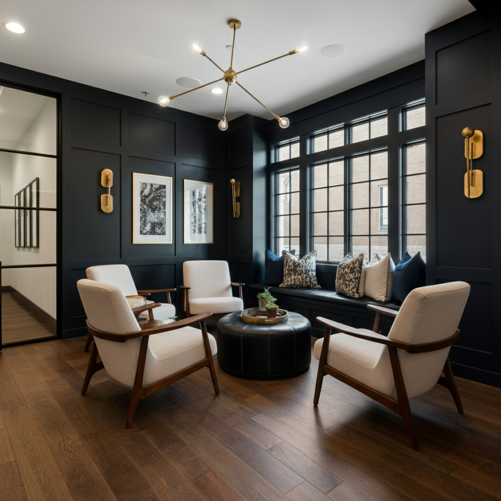 A cozy, welcoming space where our clients can relax before meetings. It’s designed to be comfortable and versatile, so we might even use it for collaborative discussions, depending on the nature of the meeting.